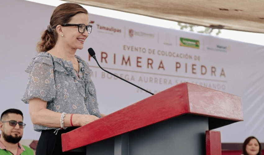 San Fernando, Tamaulipas.– Como resultado del entorno de confianza para la inversión comercial en Tamaulipas, la secretaria de Economía, Ninfa Cantú Deándar junto con la presidenta municipal de San Fernando, Veronica Aguirre y Rodrigo Flores Amezcua, director de Relaciones Institucionales de Walmart de México encabezaron la ceremonia de colocación de la primera piedra para la construcción de la tienda Mi Bodega Aurrerá que representa una inversión de 50 millones de pesos.